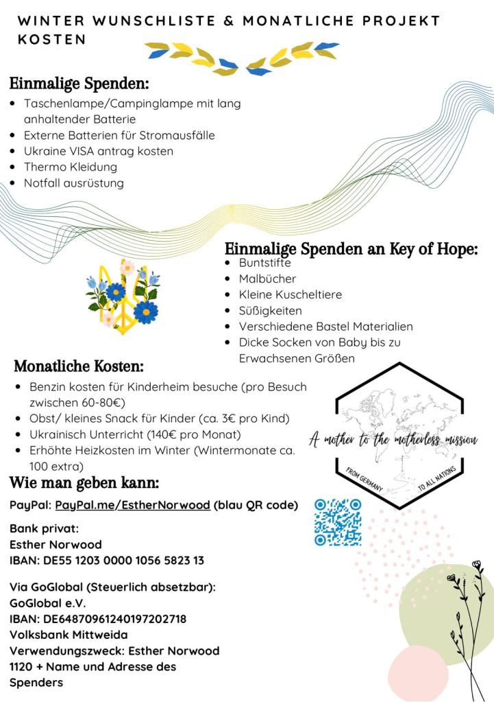 Thank you for all your encouragement and for taking part in hearing my update from Ukraine yesterday! As mentioned, I have created a small “wishlist” of items that my ministry and I need, as well as a few personal needs I may still have. Feel free to contact me or my mother, Daphne, about how you might be able to help or if you would like to donate material items.