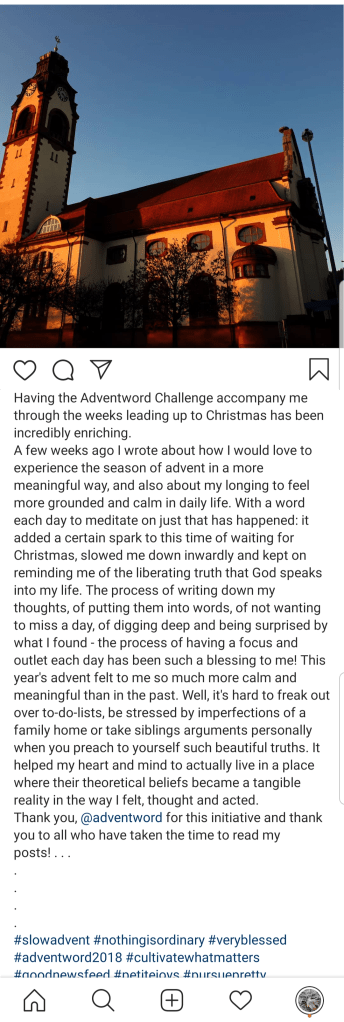 As God does, he sent help from an unlikely source: he had me stumble across the #adventword challenge on Instagram. I had never been an avid social media poster, yet felt compelled to drive right into this different kind of advent calendar. Every day a word was given as a prompt and people all over the internet shared what came to mind for them: photos, drawings, prayers, poems, thoughts.
