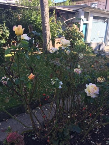 While I waited I saw the same little rosary with Jesus on the background of a wooden cross ✝️ I had bought for the friend who does so much for all the lonely and handicapped ones who come to his little and felt protected, Jesus was there! The big shouting man said quietly, we speak English but your German is good. We spoke English, friendly, joking a bit, kind … and on the way out the rose tree with white blossoms, orange buds and red hips on one bush …