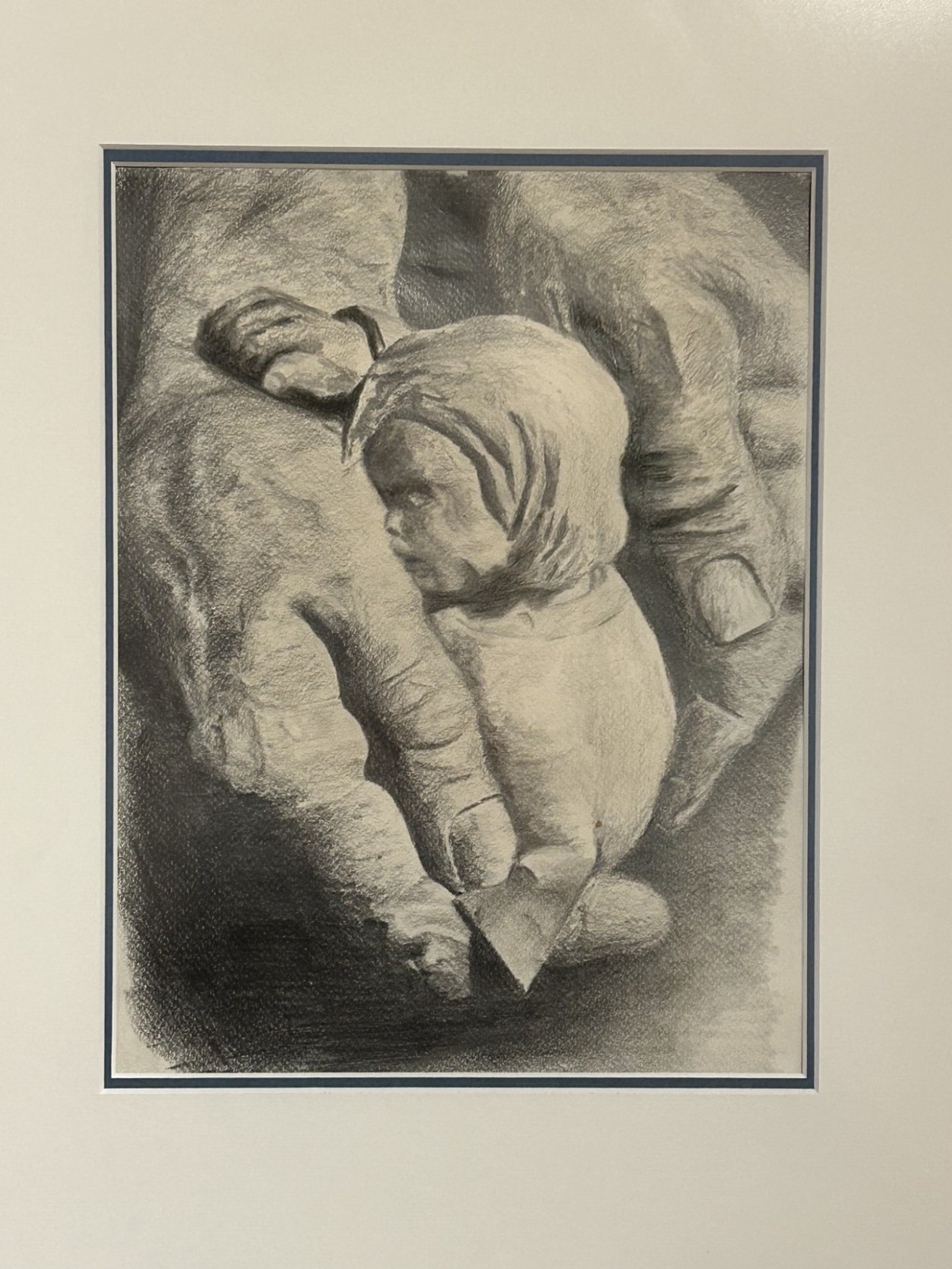 It was one of my first gifts for my wife Lauren. I had drawn it after a picture of a small wooden sculpture of a child faithfully resting in a big hand. I wanted to share with Lauren this beautiful image of complete trust, no fear but the conviction that nothing can happen because I am held in the hand of a God who loves me and no one can pick me out of it.