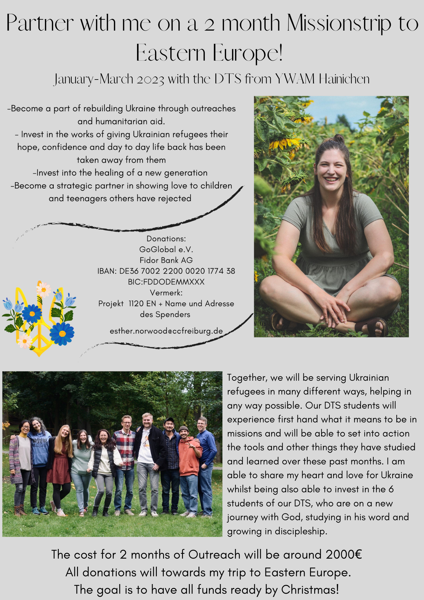 Born in Freiburg and daughter of one of our church members, Esther works with Ukrainian children that are orphaned and/or had to flee their homes. Our church supports Esther in prayer and financially.