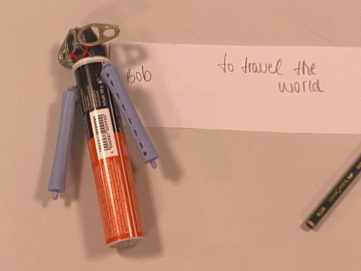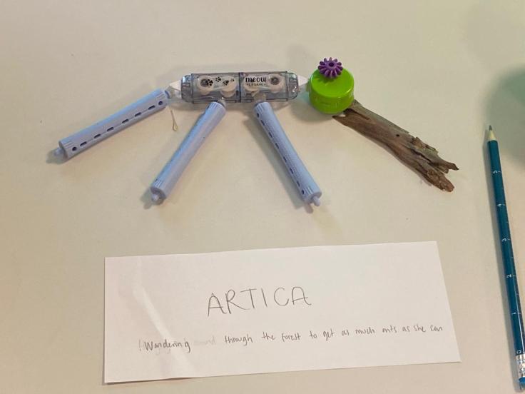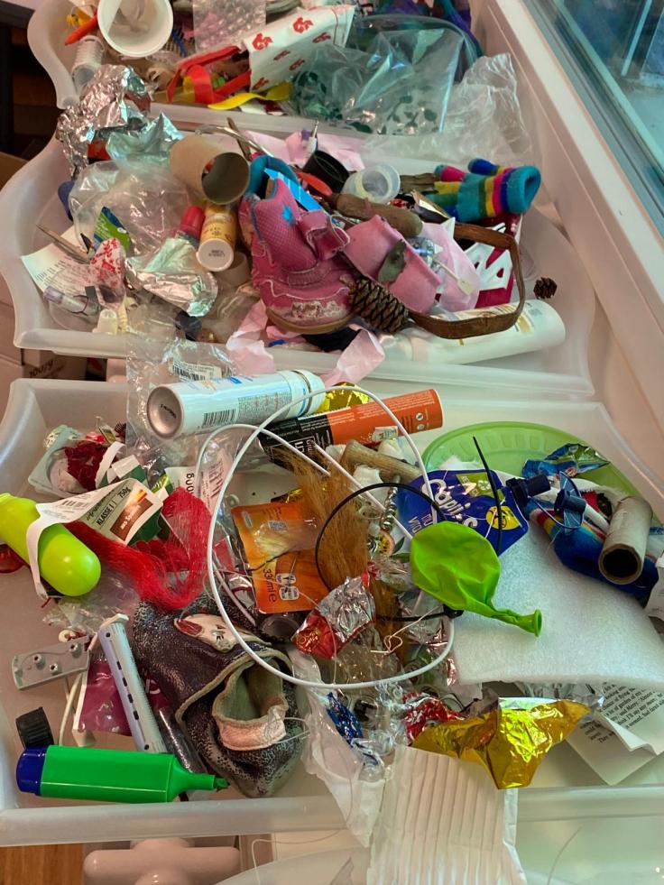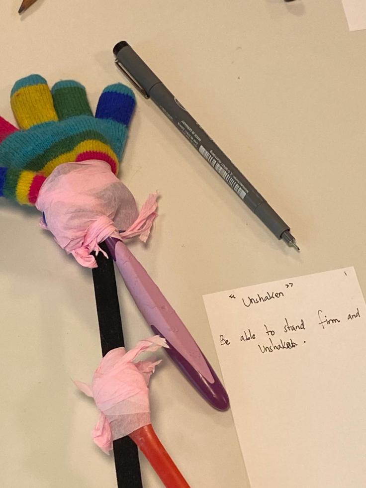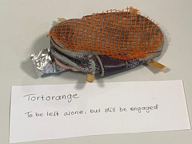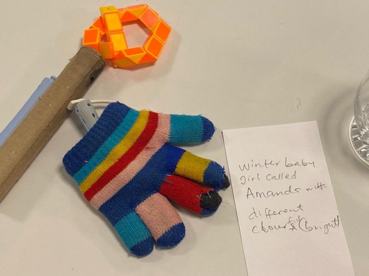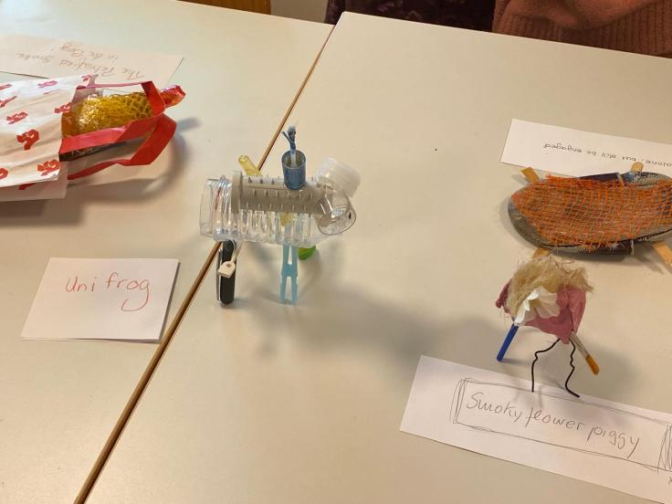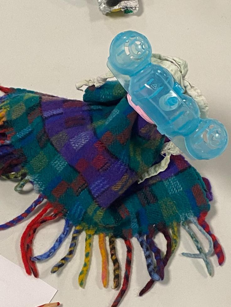 After enjoying a lovely breakfast together, we cleared the tables for some hands-on creativity. Megan had prepared trays filled with what she playfully called “beautiful rubbish” – balloons, wrappings, worn-out gloves, paper plates, and all sorts of materials that would normally find their way to the bin. Armed with hot glue guns, we had fifteen minutes to create living creatures from these humble materials.